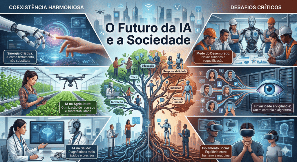 Especialistas preveem que a IA continuará a evoluir, desempenhando papéis cada vez mais integrados em setores como saúde, transporte e educação. Contudo, sua disseminação requer um olhar atento sobre suas consequências sociais.